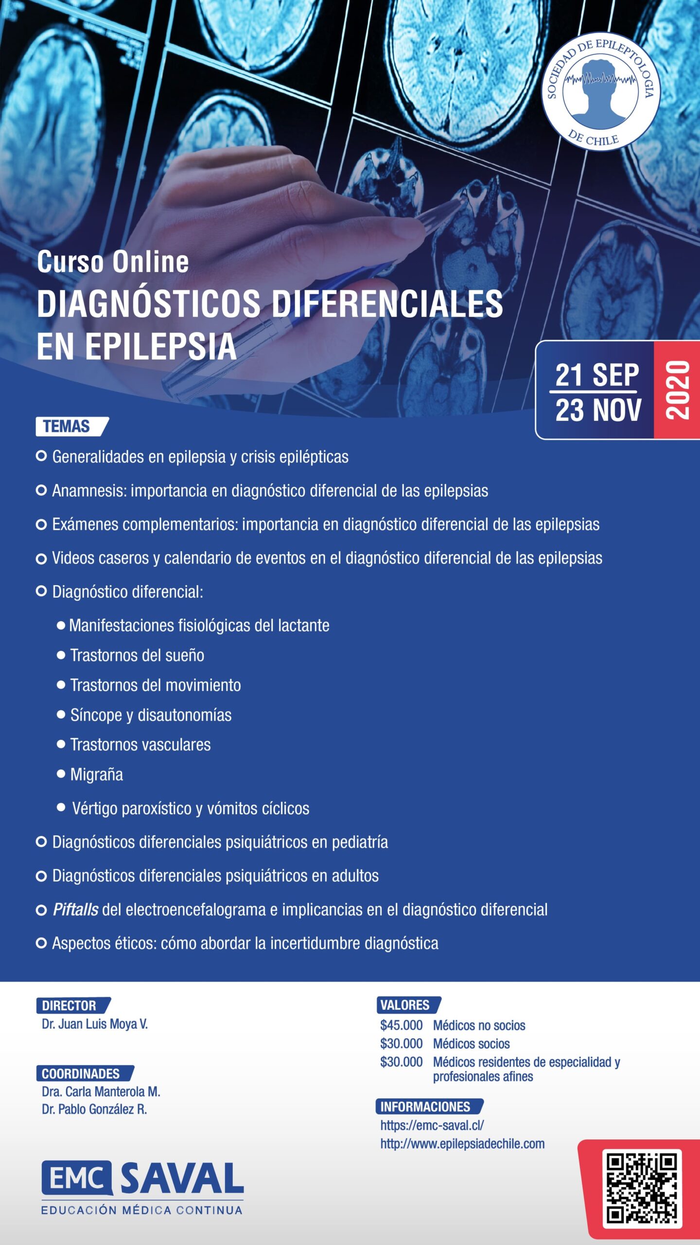 Las actividades del curso serán hospedadas en la plataforma de Educación Continua SAVAL.net, y serán desarrolladas entre los días 21 de septiembre y 3 de diciembre de 2020. Los valores pueden ser consultados en el afiche adjunto en esta publicación. Actualmente, nos encontramos realizando las gestiones para contar con acreditación oficial por parte de CONACEM.