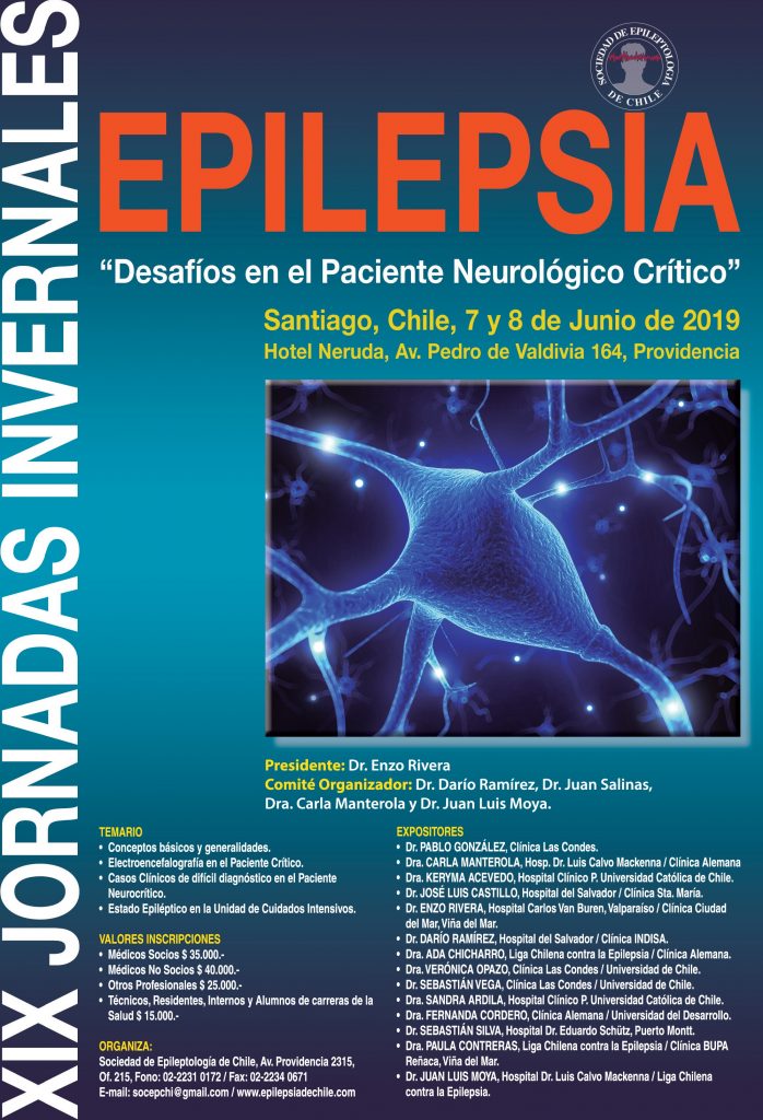 Como les comentamos recientemente, la XIX edición del evento se denominará “Epilepsia en el paciente neurológico crítico”. El evento tendrá lugar el viernes 7 y sábado 8 de junio de 2019, en el Hotel Neruda (ubicado en Av. Pedro de Valdivia Nº 164, Providencia, Santiago).