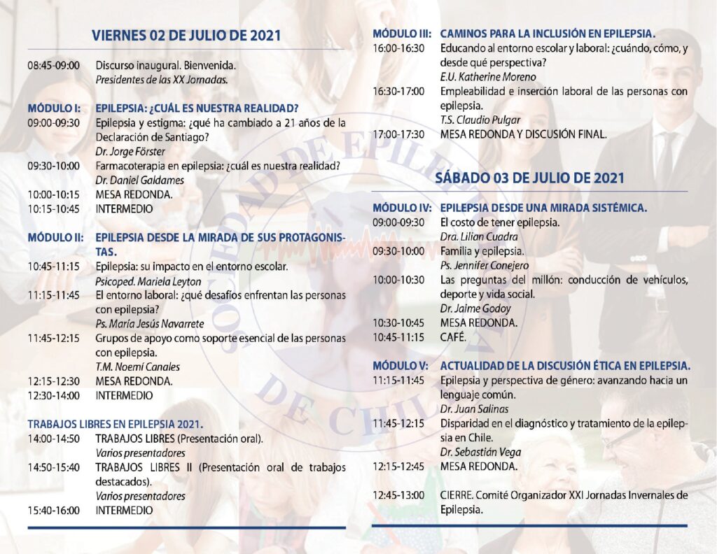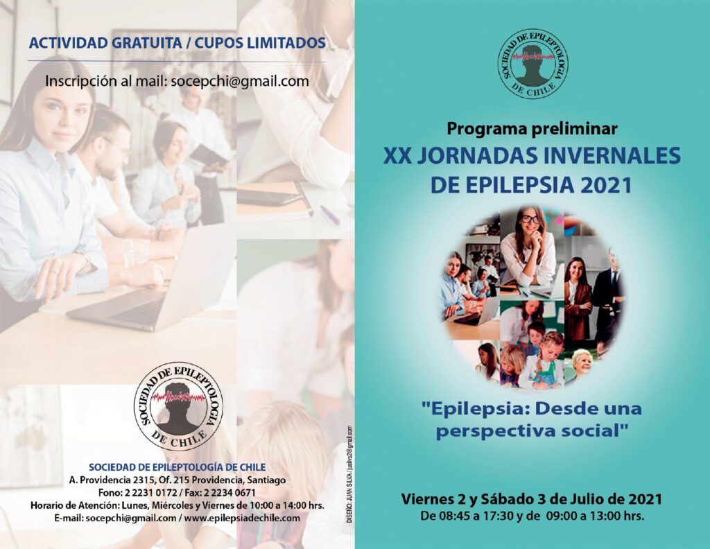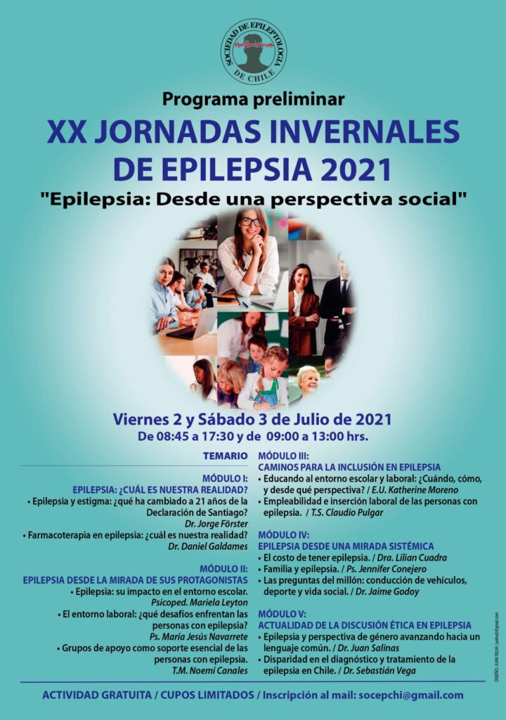 Como les comentamos anteriormente, las XX Jornadas Invernales de Epilepsia, tituladas “Desde una perspectiva social”, se llevarán a cabo el viernes 2 y sábado 3 de julio de 2021, mediante la plataforma Zoom. La actividad será de carácter gratuito, y las inscripciones pueden ser realizadas a través del correo electrónico de la sociedad (socepchi@gmail.com).