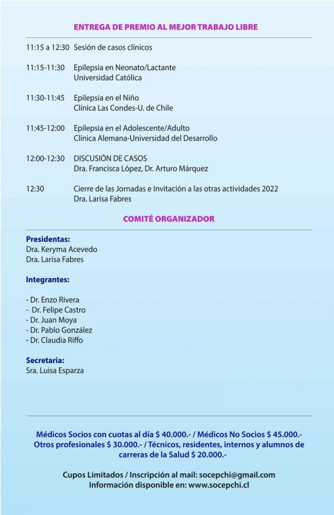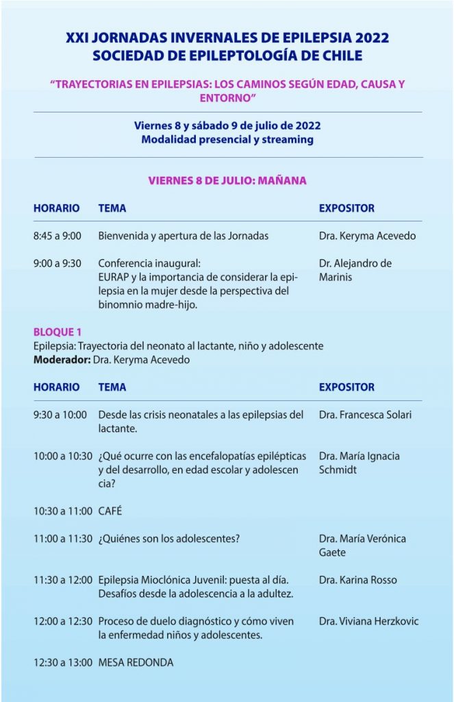 Los esperamos en esta nueva versión, denominada “Trayectorias en epilepsias: los caminos según edad, causa y entorno”, que será realizada por primera vez en modalidad mixta (presencial y online). La actividad retornará al Hotel Neruda, ubicado en Providencia, donde se recibirá a un número de asistentes presenciales, que dependerá del aforo permitido en el mes de julio. Quienes no consigan un cupo presencial podrán participar de la totalidad del evento en forma remota, con las mismas presentaciones transmitidas en tiempo real.