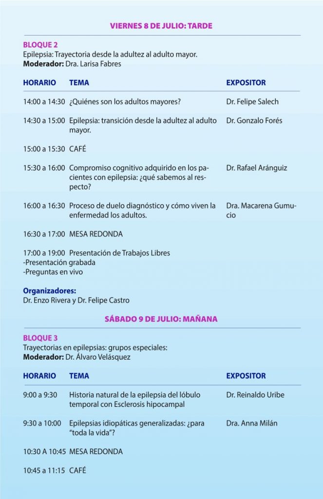 Contaremos con médicos especialistas de distintas regiones y hospitales a lo largo del país, quienes nos ayudarán a construir una visión global de cómo se transita a lo largo de la vida y el rol del equipo a cargo de manejar integralmente a la persona con epilepsia. Destacamos la participación no sólo de epileptógos, sino también de adolescentólogos, geriatras y psiquiatras, dentro de nuestros expositores. No dejaremos de lado la importancia del binomio madre-hijo, aspecto que será desarrollado en la charla inaugural de nuestras jornadas.