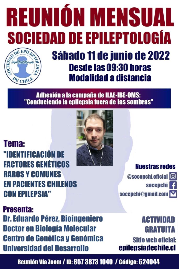 Nuestra próxima convocatoria se llevará a cabo el sábado 11 de junio de 2022, desde las 09:30 AM, en modalidad online, utilizando la plataforma Zoom. El Dr. Eduardo Pérez, Bioingeniero y Doctor en Biología Molecular del Centro de Genética y Genómica de la Universidad del Desarrollo, nos presentará el tema «Identificación de factores genéticos raros y comunes en pacientes chilenos con epilepsia». Del mismo modo, compartimos con ustedes los datos de reunión.